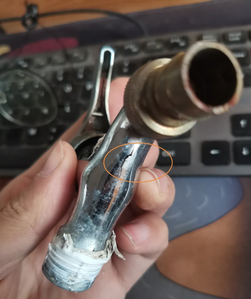 大家可以看一下我这个水龙头的图片。水龙头底下裂开了,我记得上一个水龙头也是在那个地方裂开的。
