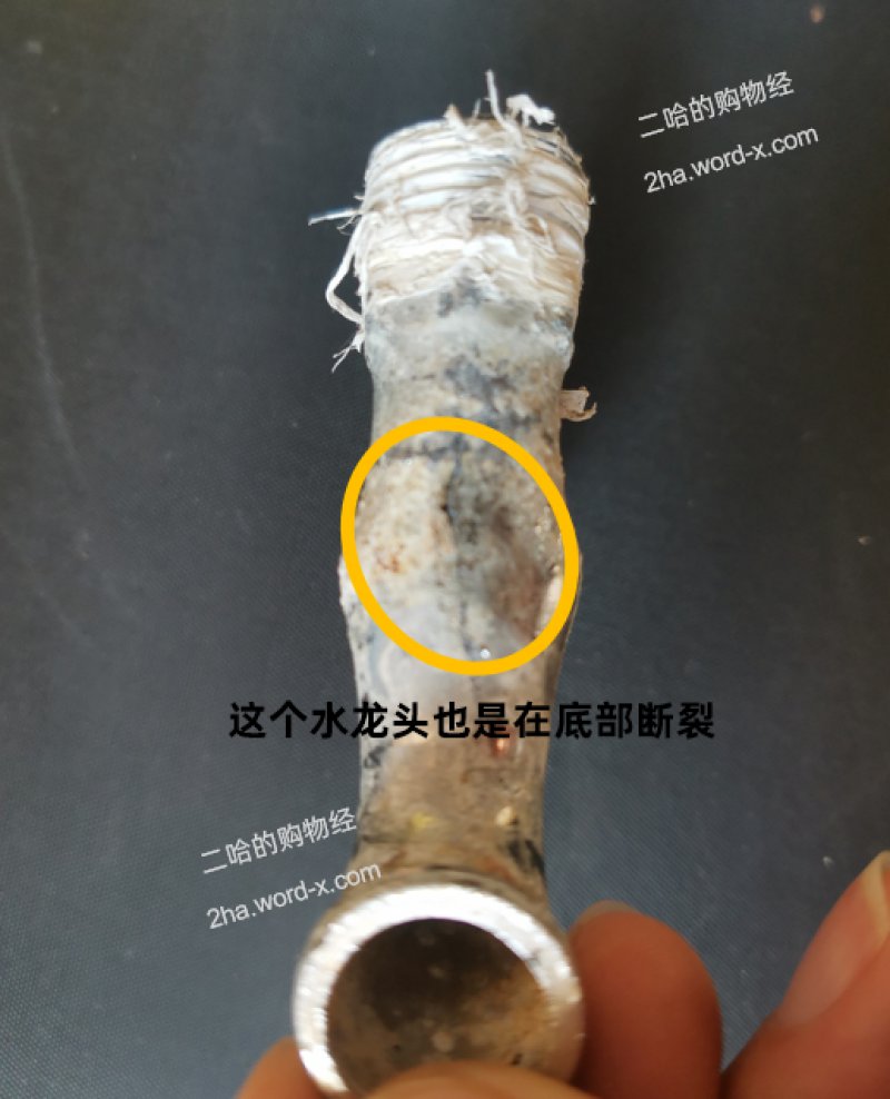 这里就有一个教训,像你在网上买的五六块钱还包邮的水龙头基本上都是合金的。所谓的纯铜,只有水龙头的嘴是纯铜的,非常不耐用。要是在天气暖和的南方还好一些,基本没问题。在北方基本上撑不了一个冬天,因为从秋天到冬天,在经过多次冻融循环和长时间的高水压之后,这些合金的水龙头会产生很多细微的裂纹,水压一大就会裂开,而最容易裂开的地方就是水龙头肚子底下,就是上面图片中我圈出来的地方。