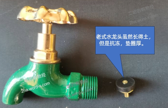 所以北方室外最好用这种老式的水龙头,这种水龙头的垫圈比较厚而且很结实,它的止水原理是压住这个厚厚的垫圈,因此比较抗冻。就是不太好看,不city。